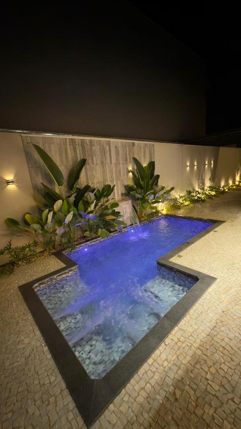 Piscina aquecida ?? ? Com iluminação, cascata e ducha com água quente.